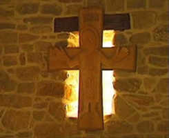 do presbytáře a detail vyřezávaného kříže před východním