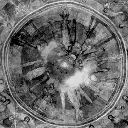 Ze značně porušené výzdoby svislé stěny apsidy je vidět řada