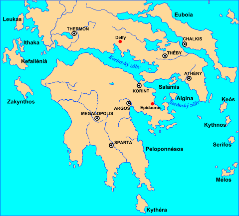 1. Mapka jižního Řecka s peloponnéským poloostrovem.